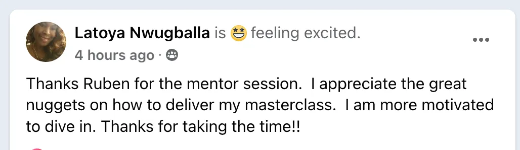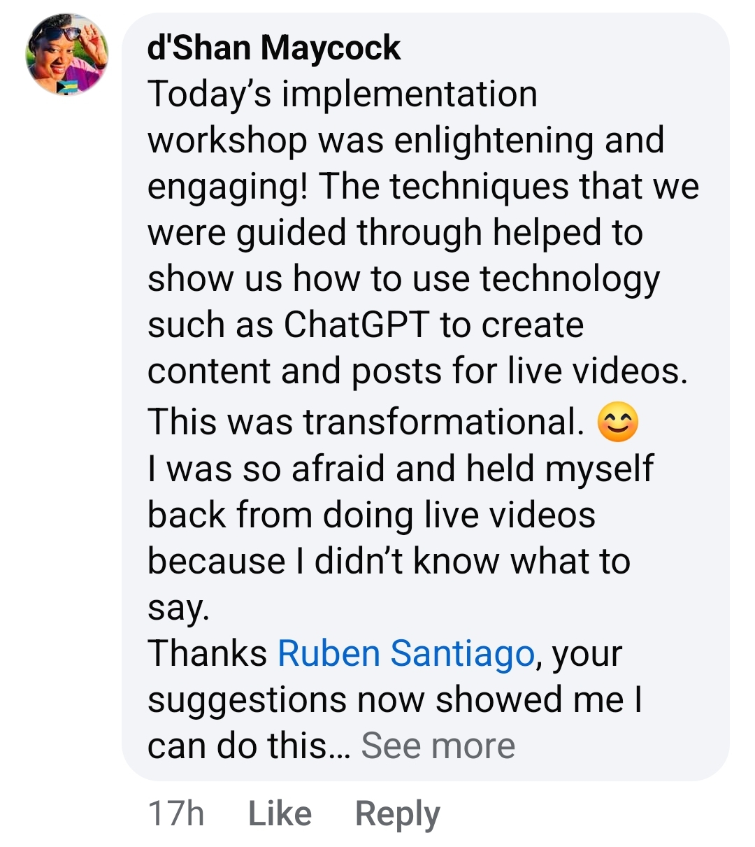 EARNINGS DISCLAIMER: We don't believe in "get rich" programs - only in hard work, adding value, building a real and professional career, and serving others with excellence and consistency. Our trainings are intended to help you share your message with a wider audience and to make a difference in the world while growing your personal brand. Our programs take a lot of work and discipline just like any worthwhile endeavor or professional continuing education program. As stipulated by law, we can not and do not make any guarantees about your ability to get results or earn any money with our ideas, information, tools or strategies. We don't know you and, besides, your results in life are up to you. Agreed? We just want to help by giving great content, direction, and strategies. You should know that all products and services by our company are for educational and informational purposes only. Nothing on this page, any of our websites, or any of our content or curriculum is a promise or guarantee of results or future earnings, and we do not offer any legal, medical, tax or other professional advice. *Statements contained here were made by individuals who participated in our training. Ruben santiago does not pay any consideration for these statements.